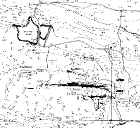 a quartz chalcocite specularite vein cuts Gowganda Sediments. The vein strikes E and dips 70S to 90. A test pit in 1967 exposed the vein for a length of about 10 feet, a width of 3.5 feet, of which 1 foot was massive chalcocite and specularite